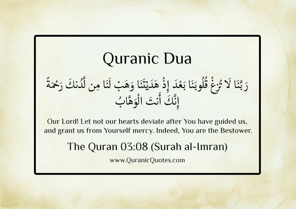 “(Mereka berdoa dengan berkata): Wahai Tuhan kami! Janganlah Engkau memesongkan hati kami sesudah Engkau beri petunjuk kepada kami, dan kurniakanlah kepada kami limpah rahmat dari sisiMu; sesungguhnya Engkau jualah Tuhan Yang melimpah-limpah pemberianNya.” (QS. Ali ‘Imran 3: Ayat 8)