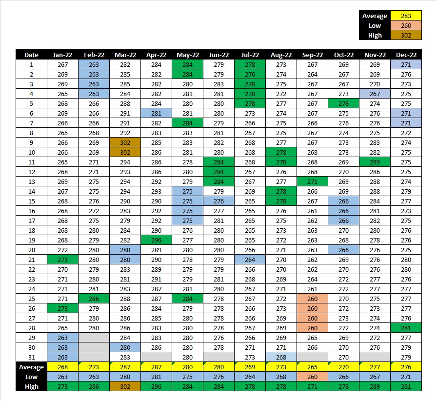 Jadual di atas menunjukkan senarai harga emas yang lengkap bagi akaun Uncang Emas KABGold untuk tahun 2022 yang lalu sebagai rujukan.