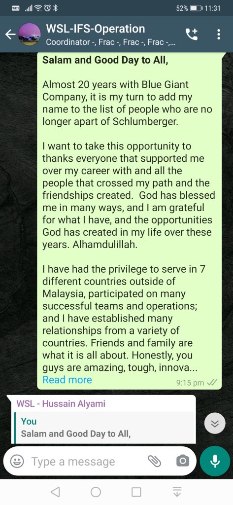 Life goes on so I am turning the page and opening the next chapter. I am grateful for the experiences and challenges that I have gained through my years with Schlumberger. I look forward to new horizons and more great experiences ahead. InsyaAllah