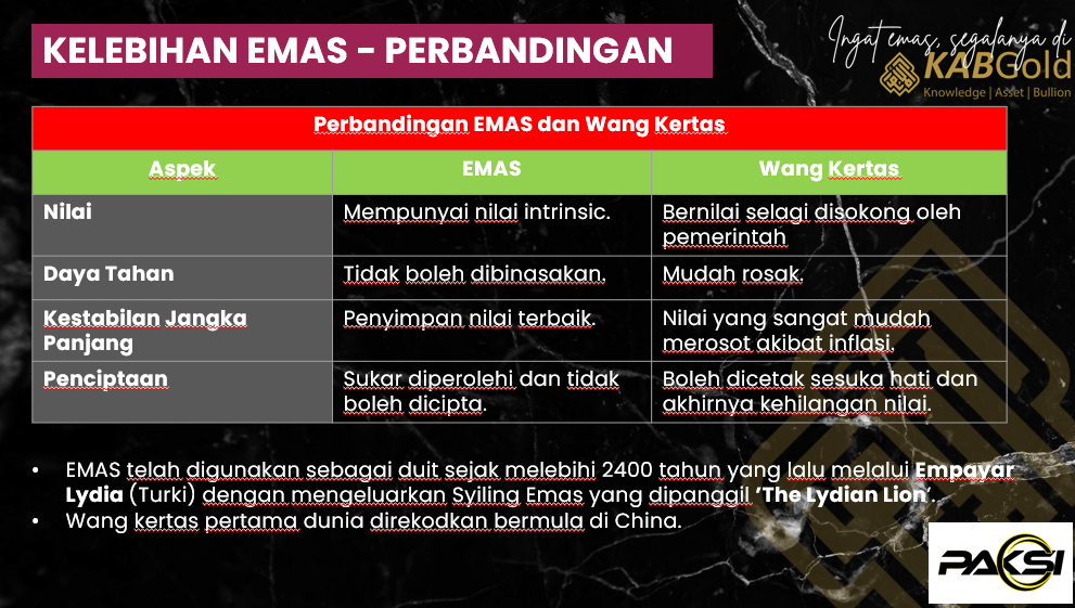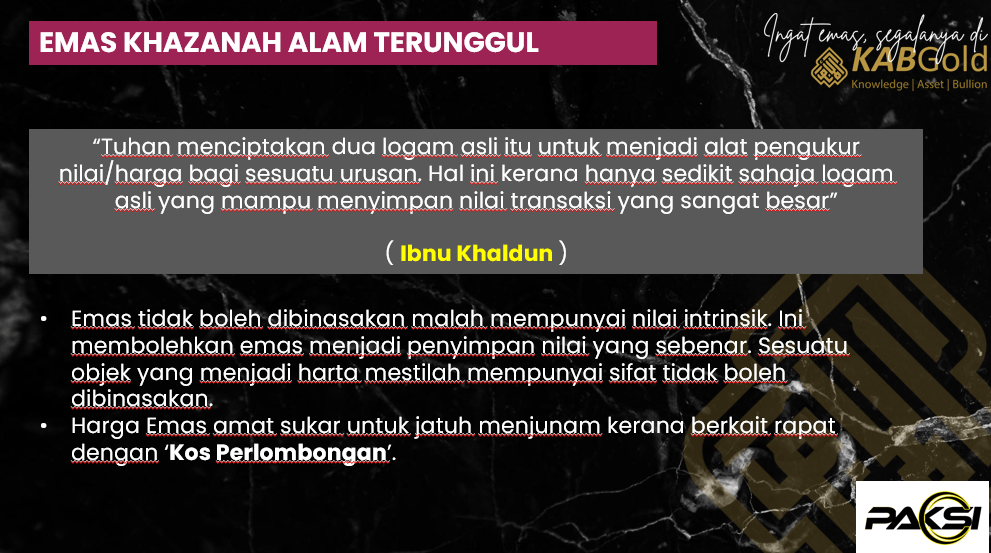 - Emas tidak boleh dibinasakan dan mempunyai ‘Nilai Instrinsik‘. Ia tidak boleh terbakar, tidak reput, tidak busuk, tidak berkarat dan sentiasa bersinar cantik.