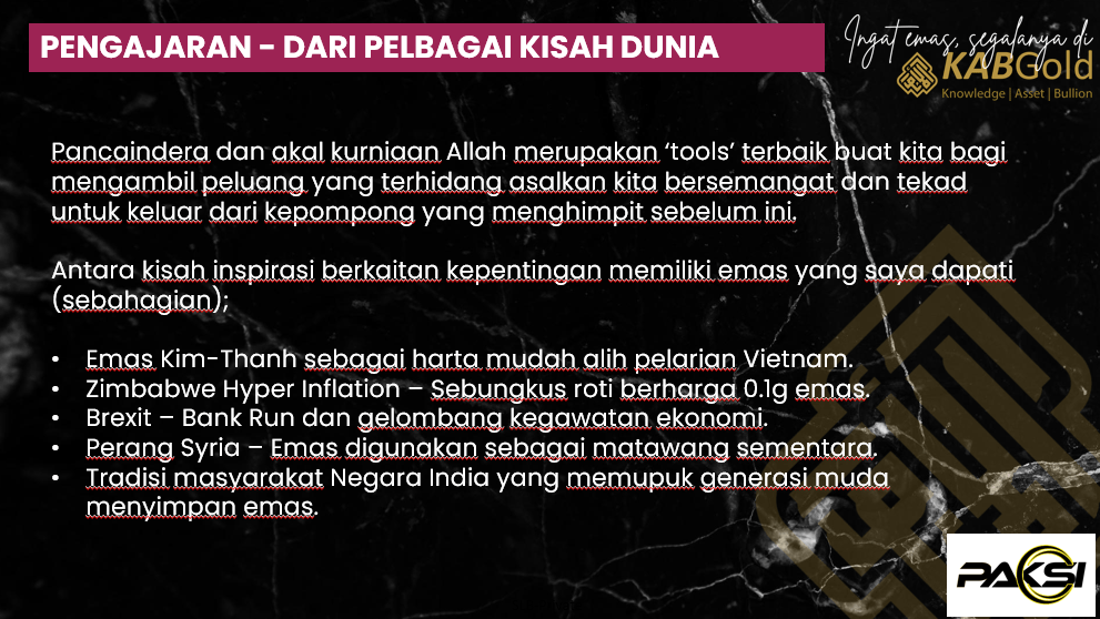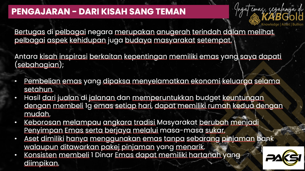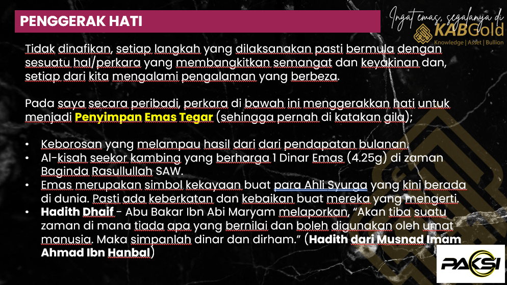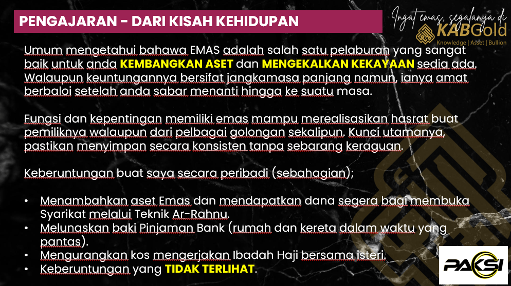 - Umum mengetahui akan apakah itu EMAS dan segala keberuntungan darinya maka, tidak perlu mengupasnya lebih lanjut. Tajuk pilihan kali ini lebih kepada membangkitkan semangat dan keyakinan untuk menjadi Penyimpan Emas yang bahagia dari pelbagai kisah inspirasi sedia ada dan ini adalah harapan saya.