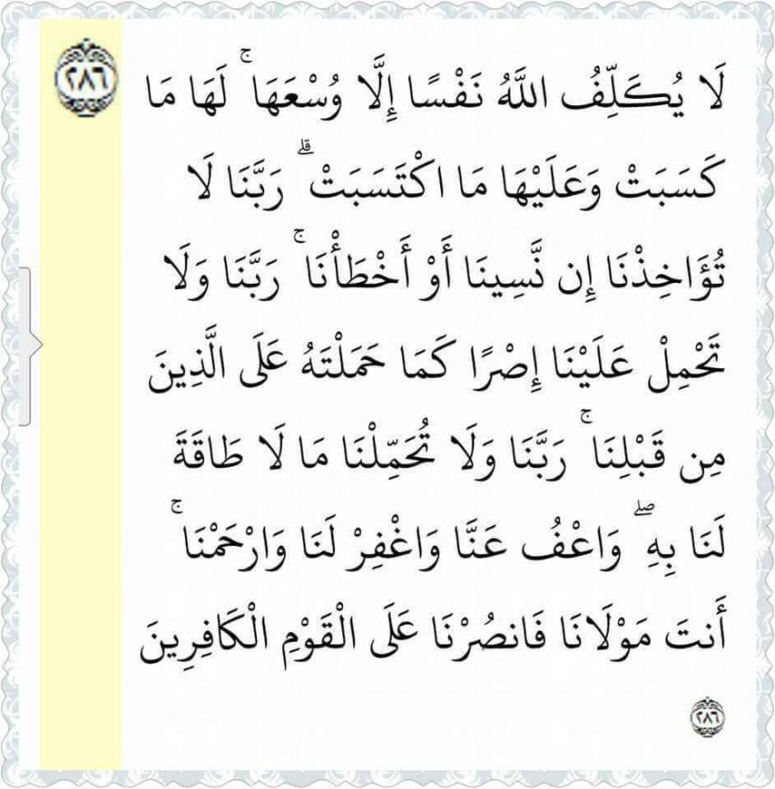 Allah tidak memberati seseorang melainkan apa yang terdaya olehnya. Ia mendapat pahala kebaikan yang di usahakannya, dan ia juga menanggung dosa kejahatan yang diusahakannya. (Mereka berdo’a dengan berkata): “Wahai Tuhan kami! Janganlah Engkau mengirakan kami salah jika kami terlupa atau kami tersalah. Wahai Tuhan kami! Janganlah Engkau bebankan kepada kami bebanan yang berat sebagaimana yang telah Engkau bebankan kepada orang-orang yang terdahulu daripada kami. Wahai Tuhan kami! Janganlah Engkau pikulkan kepada kami apa yang kami tidak terdaya memikulnya. Dan ma’afkanlah kesalahan kami, serta ampunkanlah dosa kami, dan berilah rahmat kepada kami. Engkaulah Penolong kami; oleh itu, tolonglah kami untuk mencapai kemenangan terhadap kaum-kaum yang kafir”. (Al Baqarah – Ayat 286)