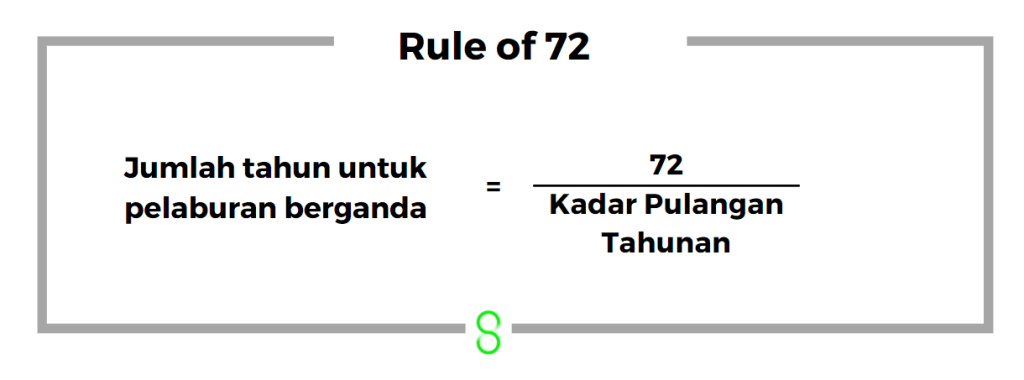 Untuk mengetahui berapa tahun yang diperlukan untuk pelaburan tersebut menjadi sekali ganda, caranya adalah 72 dibahagikan dengan kadar pulangan tahunan sesuatu pelaburan seperti formula di bawah;